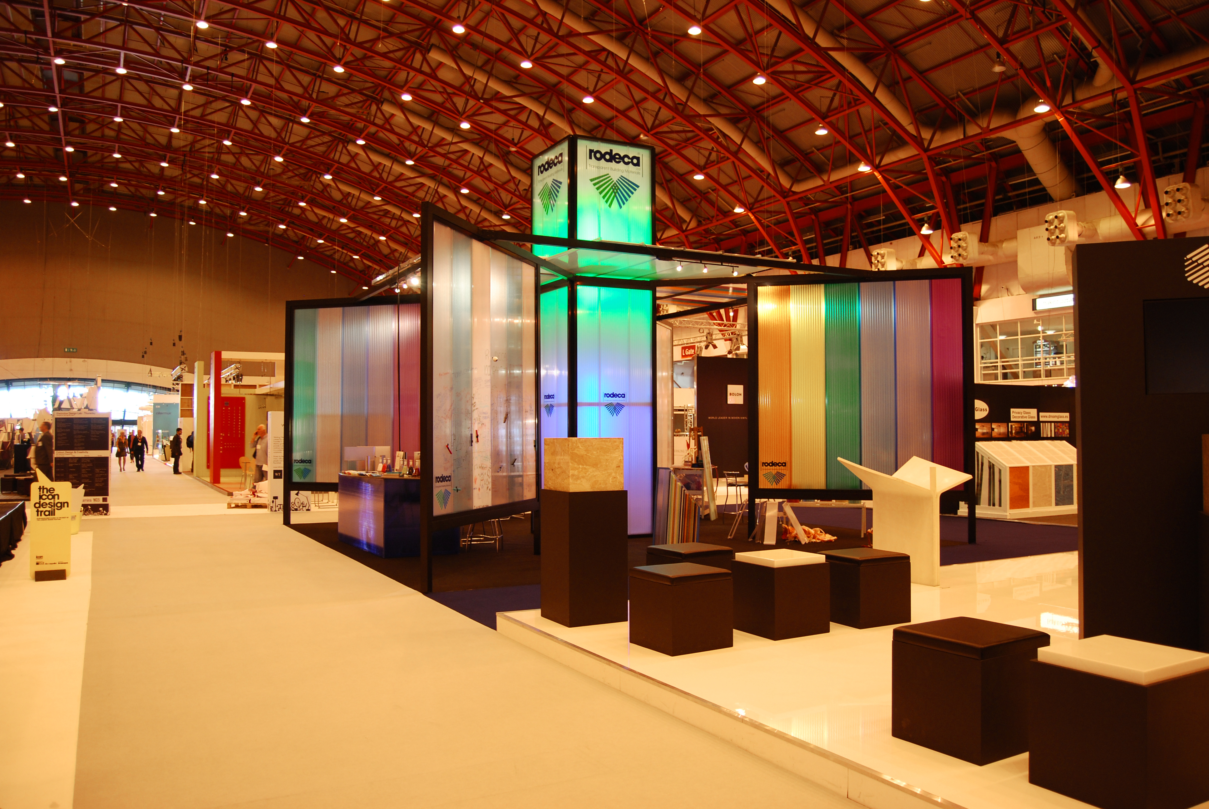Besides the traditional exterior applications, RODECA translucent panels and multi-wall-sheets are used for constructions in exhibitions, trade fairs and other interior applications. The RODECA polycarbonate elements can both be used in a functional and decorative way and RODECA has introduced a range of standard colours which can be produced in smaller quantities.